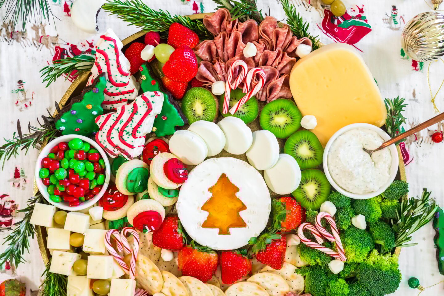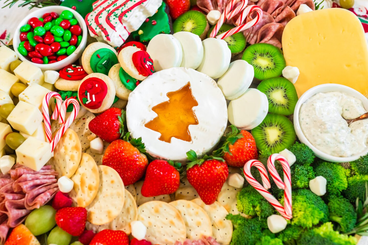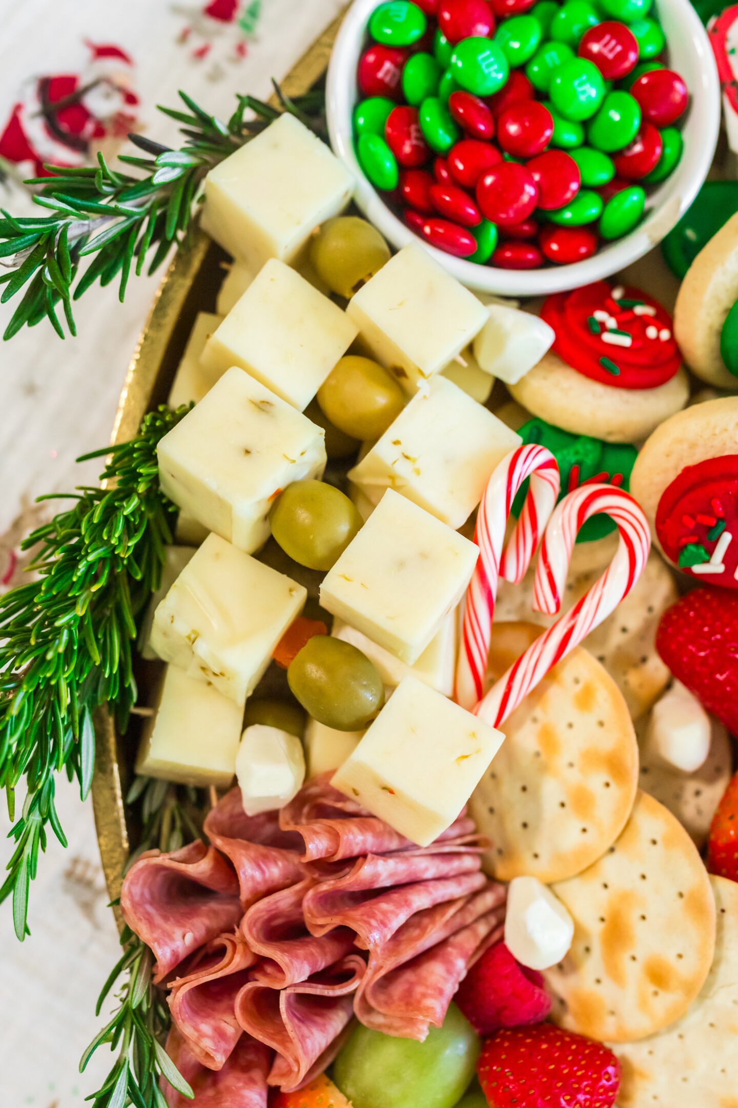 6. Add the M&M’s: Place a small bowl of red and green M&M’s above the olive and cheese section on the left side.