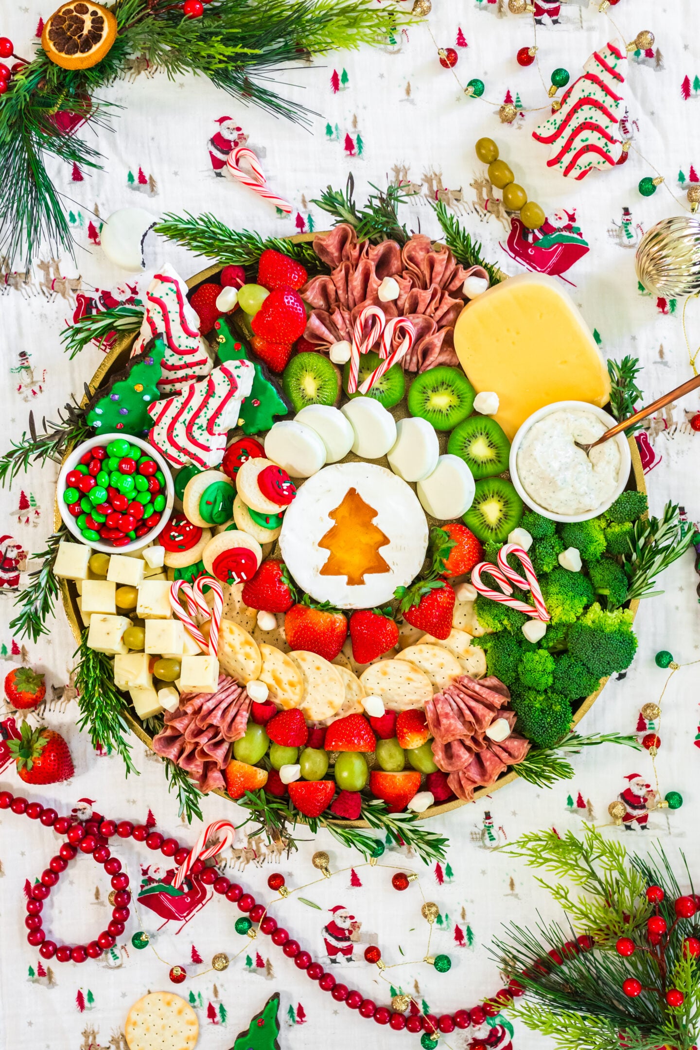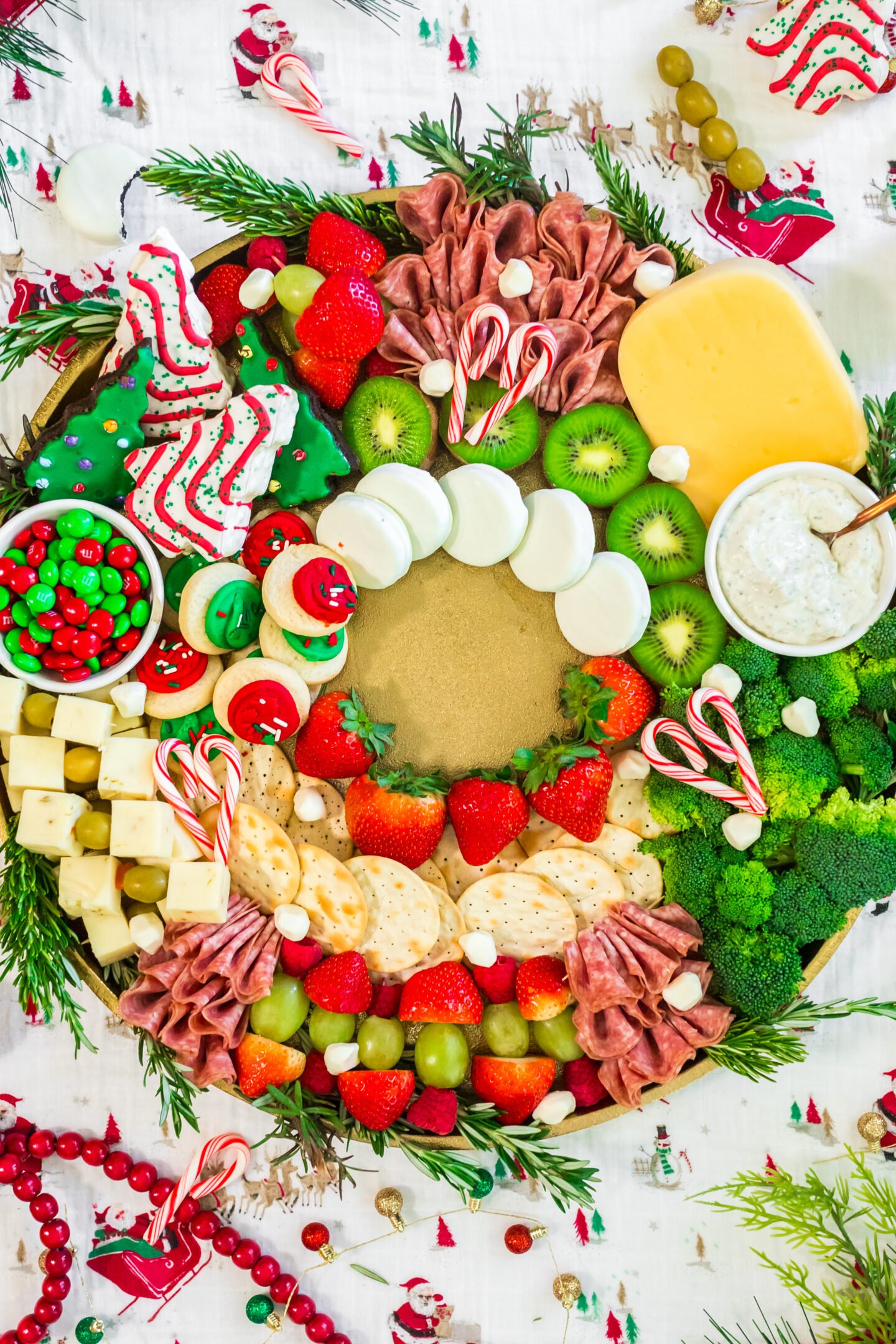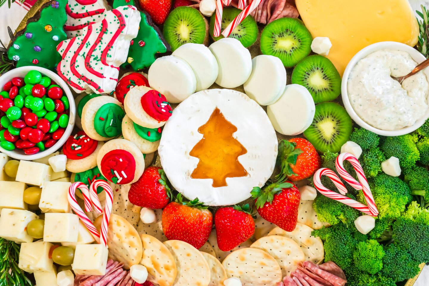 6. Add the M&M’s: Place a small bowl of red and green M&M’s above the olive and cheese section on the left side.