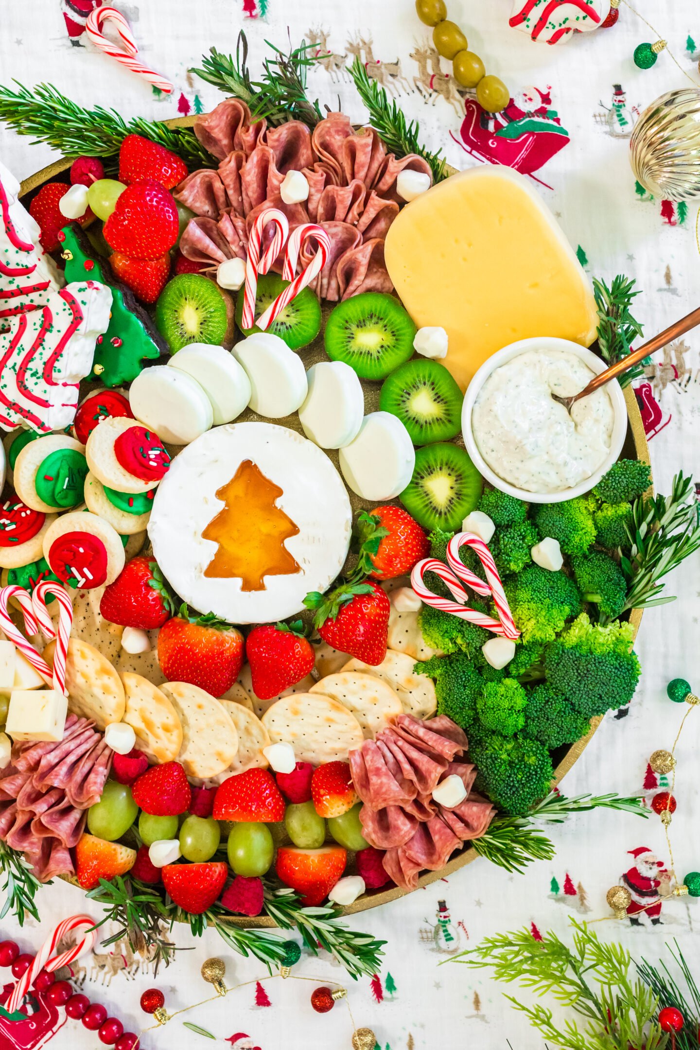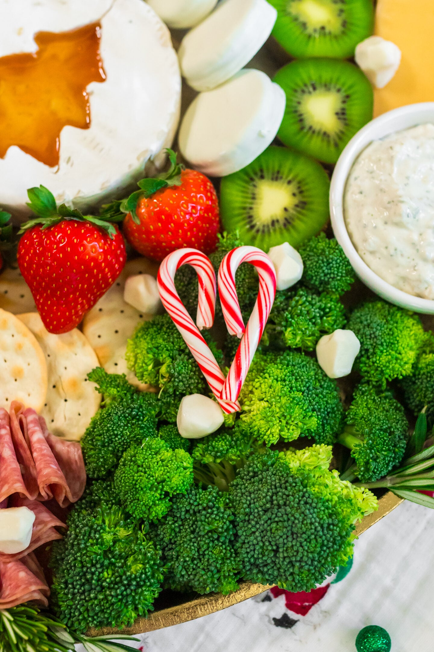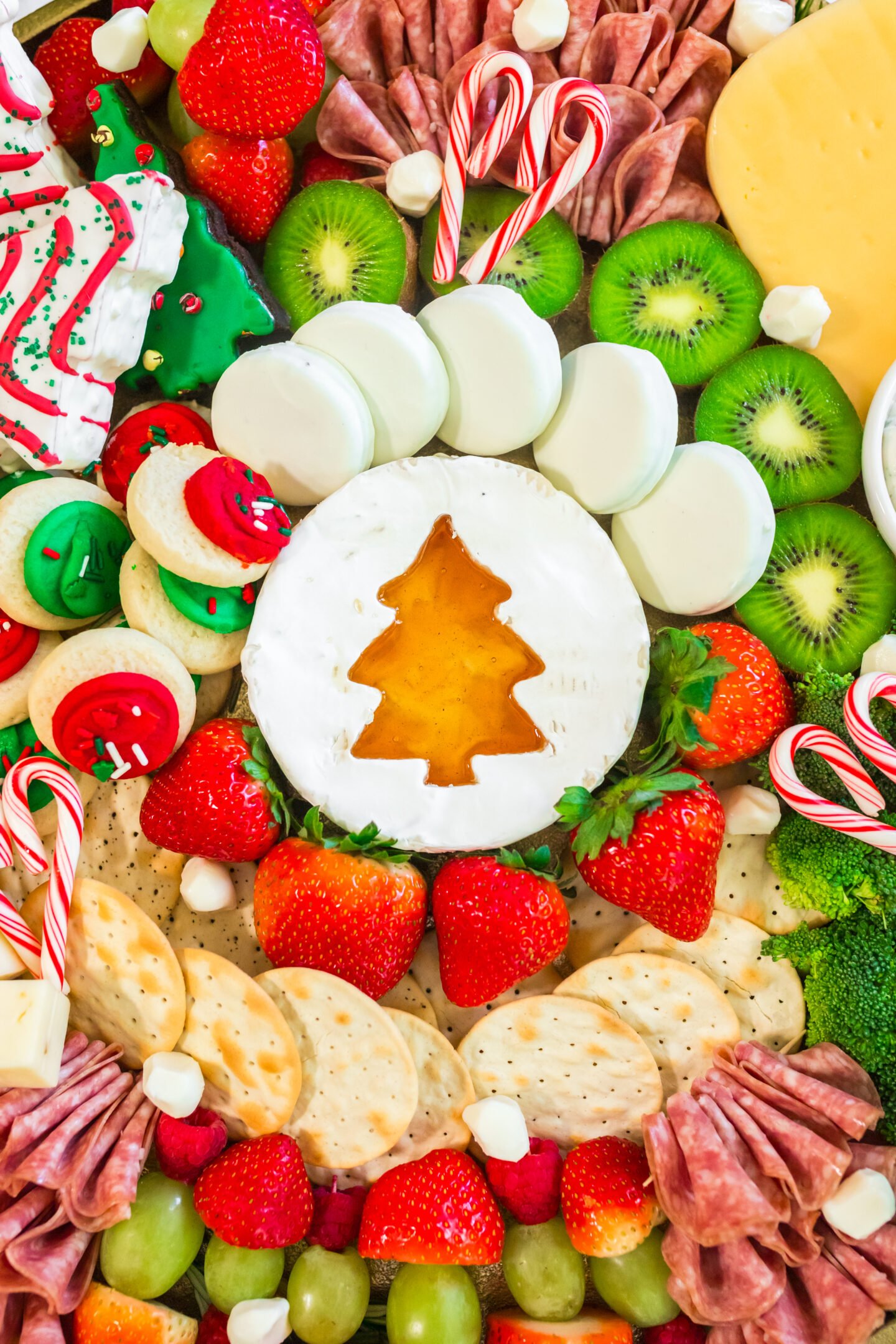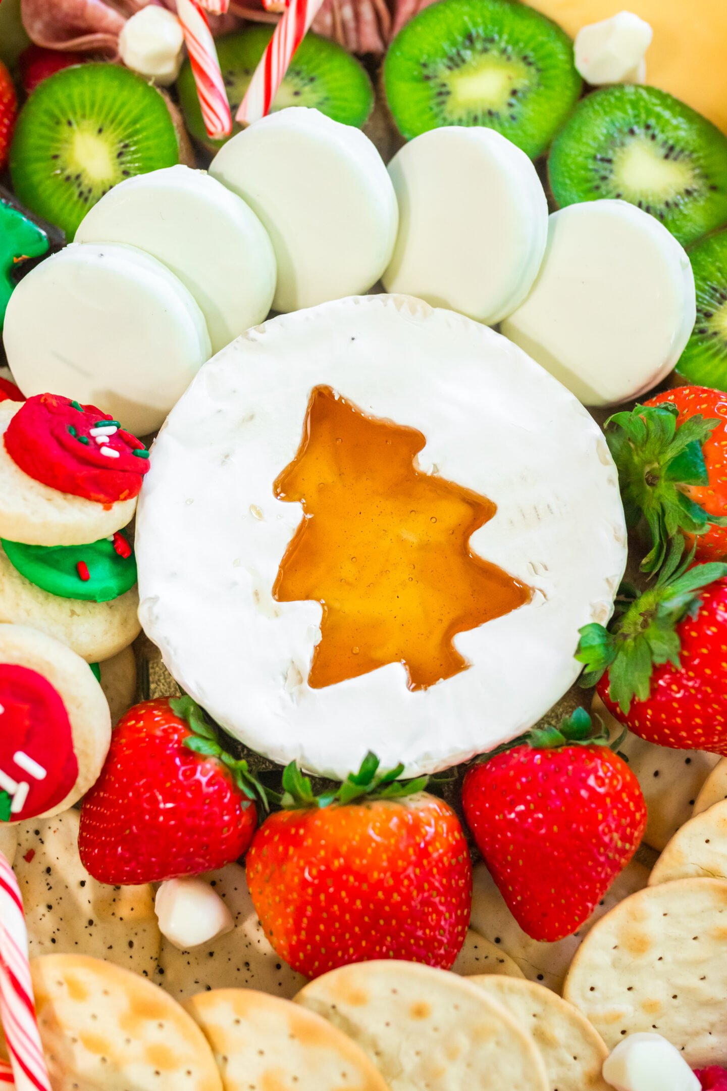 - Optional: Cut out the center of a brie wheel with a christmas tree cutter and fill with honey. Place the brie in the center of the board.