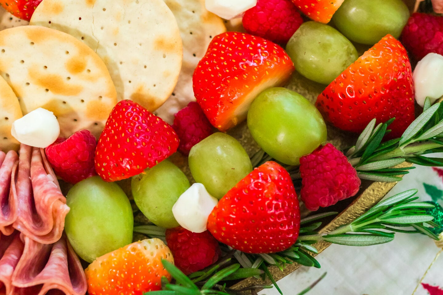 1. Make fruit skewers: Using toothpicks, skewer a strawberry, grape, and raspberry. Place these along the bottom center and top left curves of your board to begin forming the wreath shape.