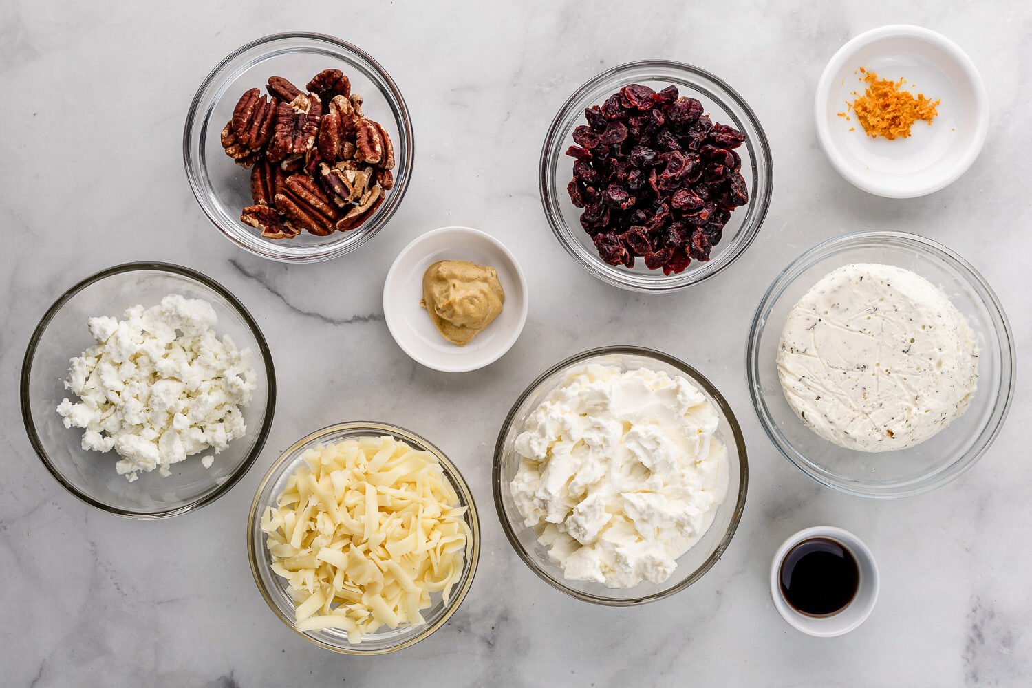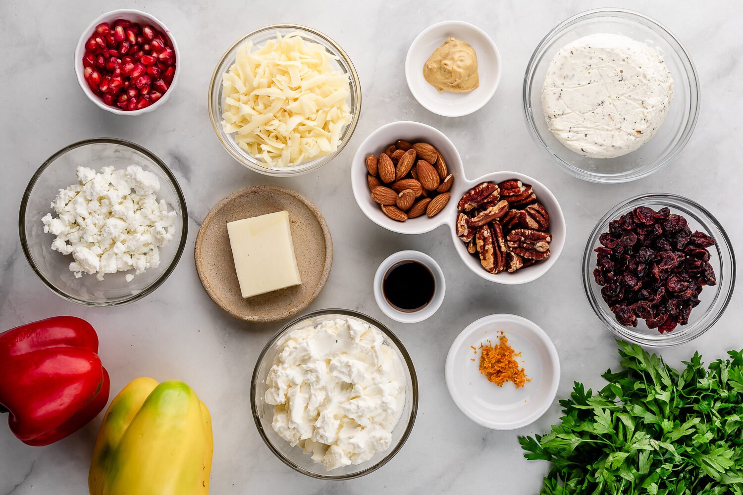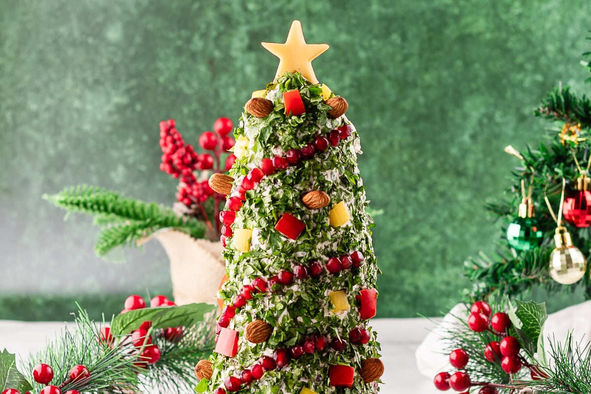A Christmas Tree Cheese Ball starts with cream cheese and a blend of flavorful cheeses, such as Boursin, feta, and cheddar. Dijon mustard, Worcestershire sauce, dried fruit, nuts, and orange zest add depth, while fresh herbs and colorful toppings turn it into a festive holiday showpiece.