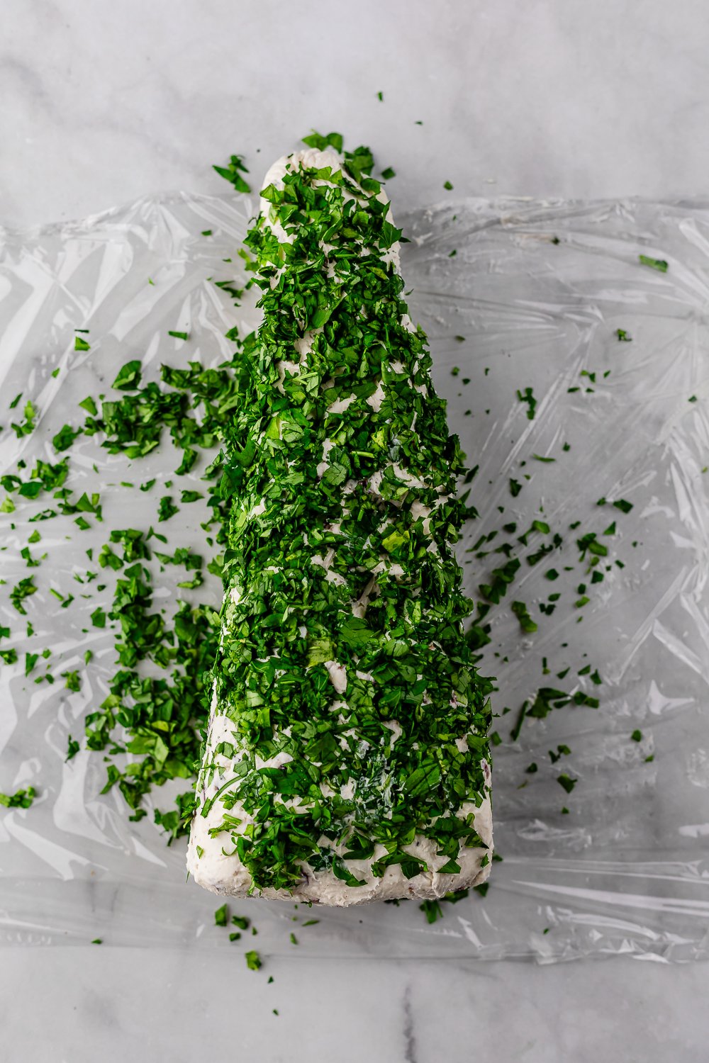 Step 2: Spread the parsley on plastic wrap, then gently roll the cheese tree to coat all sides, creating a festive, eye-catching appearance.
