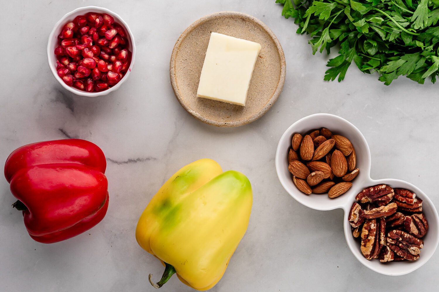 Step 1: Finely chop fresh parsley until it resembles fluffy “evergreen needles.” For the best color and flavor, choose vibrant pomegranate arils, colorful bell peppers, and fresh cherry tomatoes.