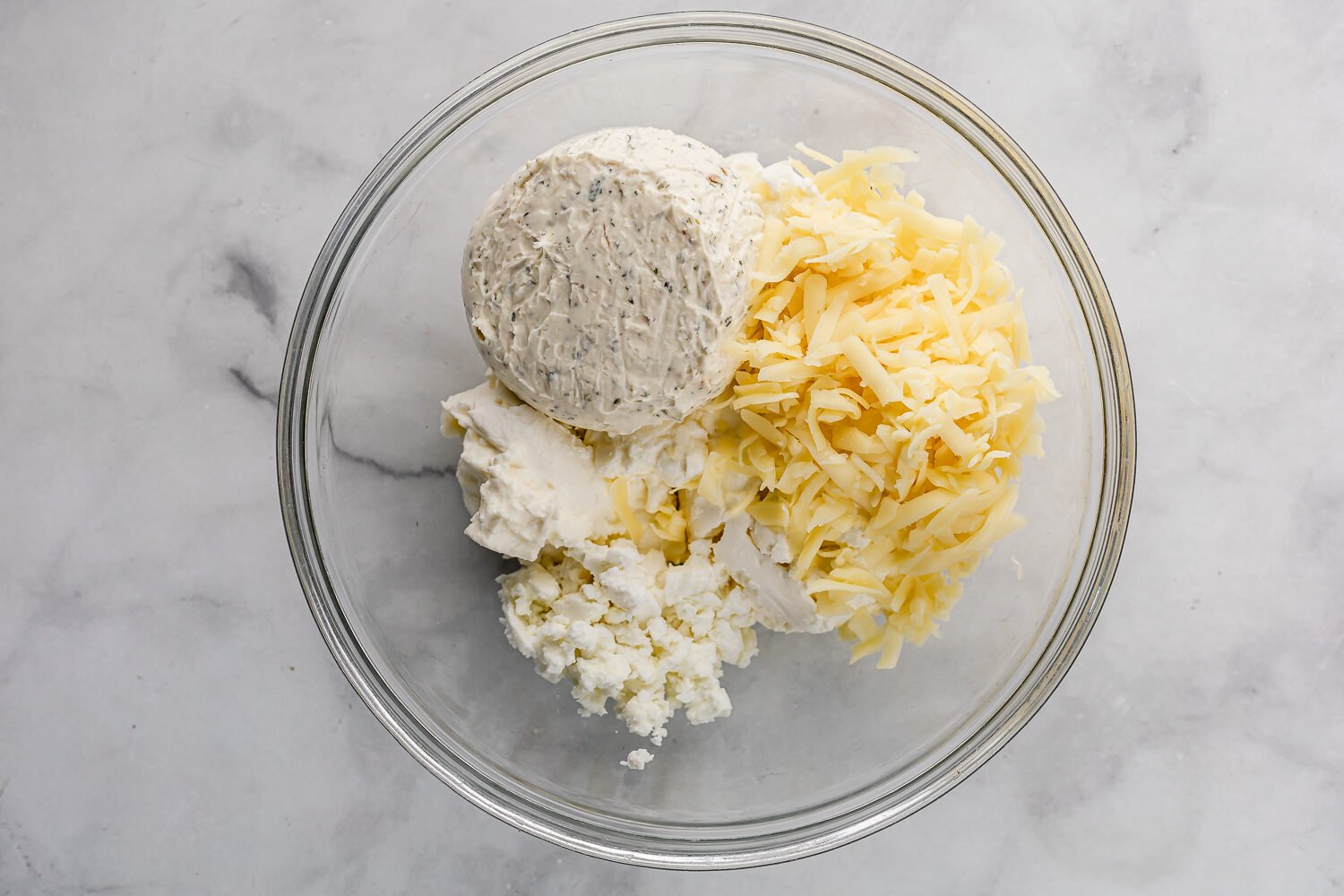 - In a large bowl add the cream cheese, Boursin, shredded cheddar and crumbled feta. Using either a gloved hand or a spoon, mix until thoroughly combined.