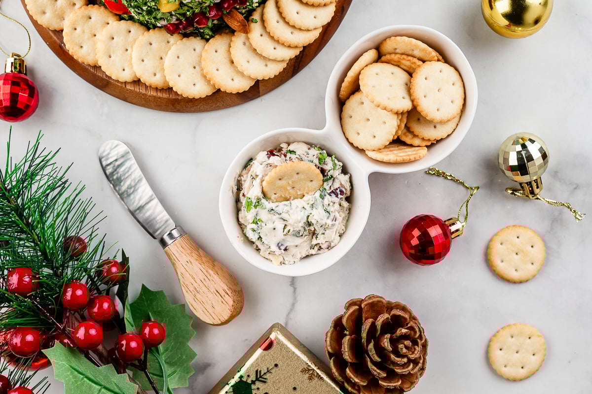 Remove it from the refrigerator about 15 minutes before serving. Place it on a platter surrounded by crackers, pretzel sticks, toasted baguette slices, veggie sticks, or bagel chips. It also looks beautiful as the centerpiece of a holiday charcuterie board.
