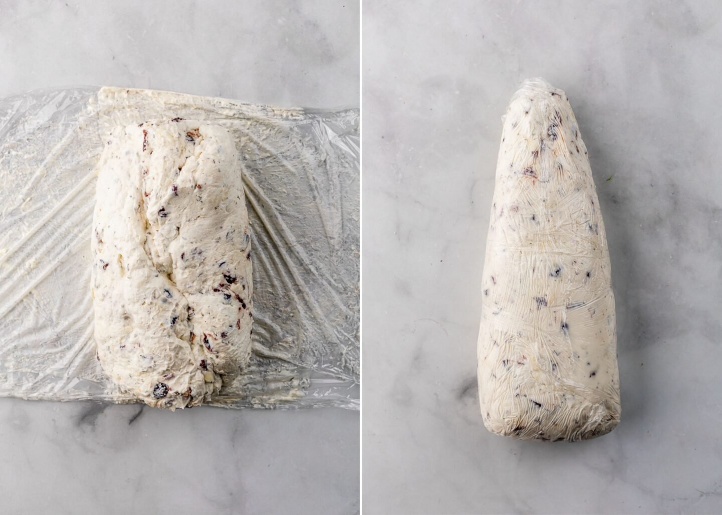 Transfer the chilled mixture onto plastic wrap and gently roll it into a log. Shape it into a Christmas tree form—tapering slightly toward the top—and flatten the base so it stands upright.