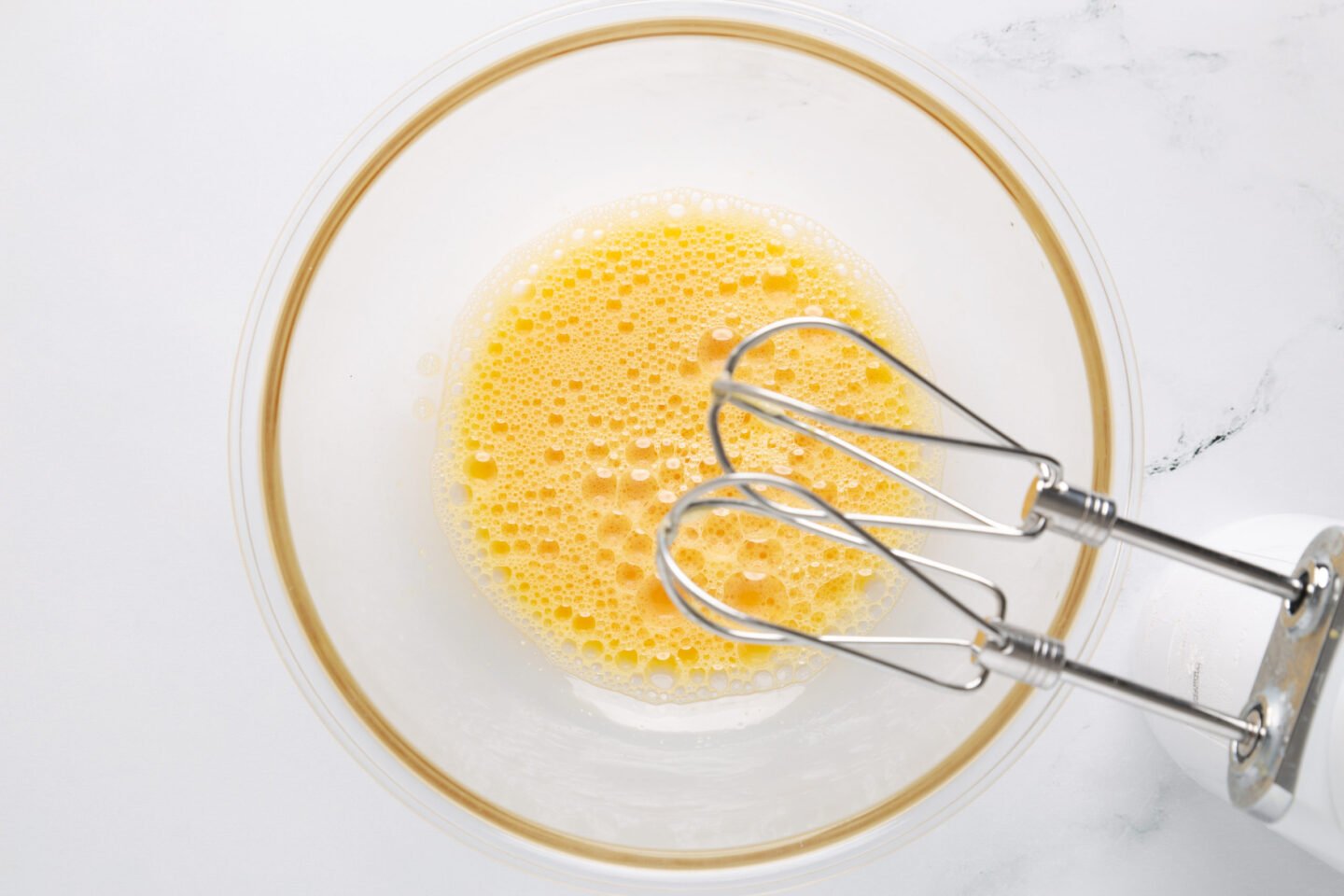 - Beat the eggs lightly in a large mixing bowl. Whisk or use a handheld mixer.