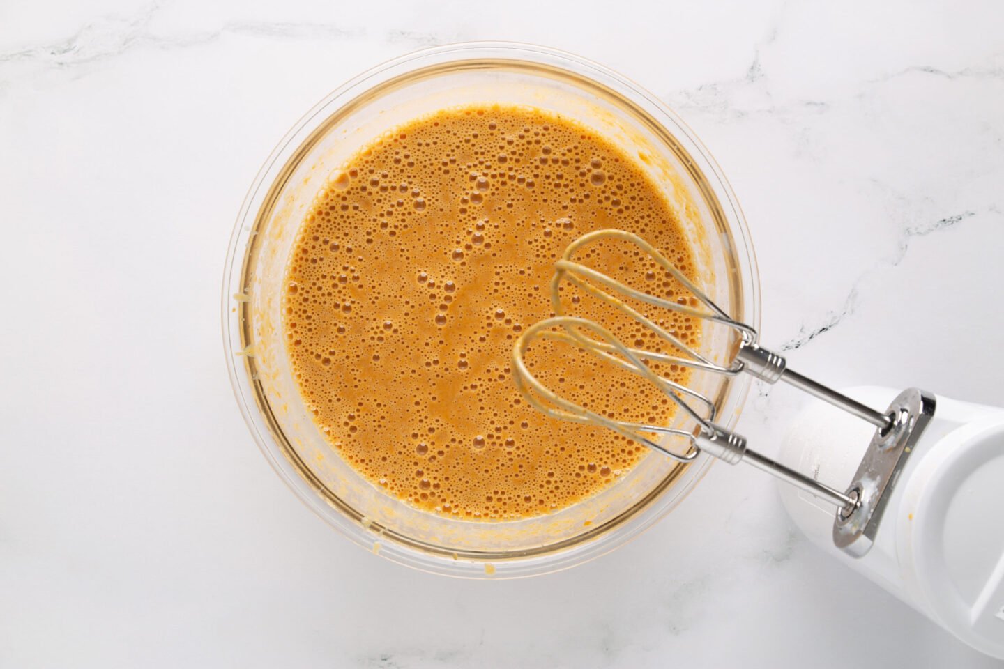- Stir the pumpkin and the sugar–spice blend into the beaten eggs until smooth.