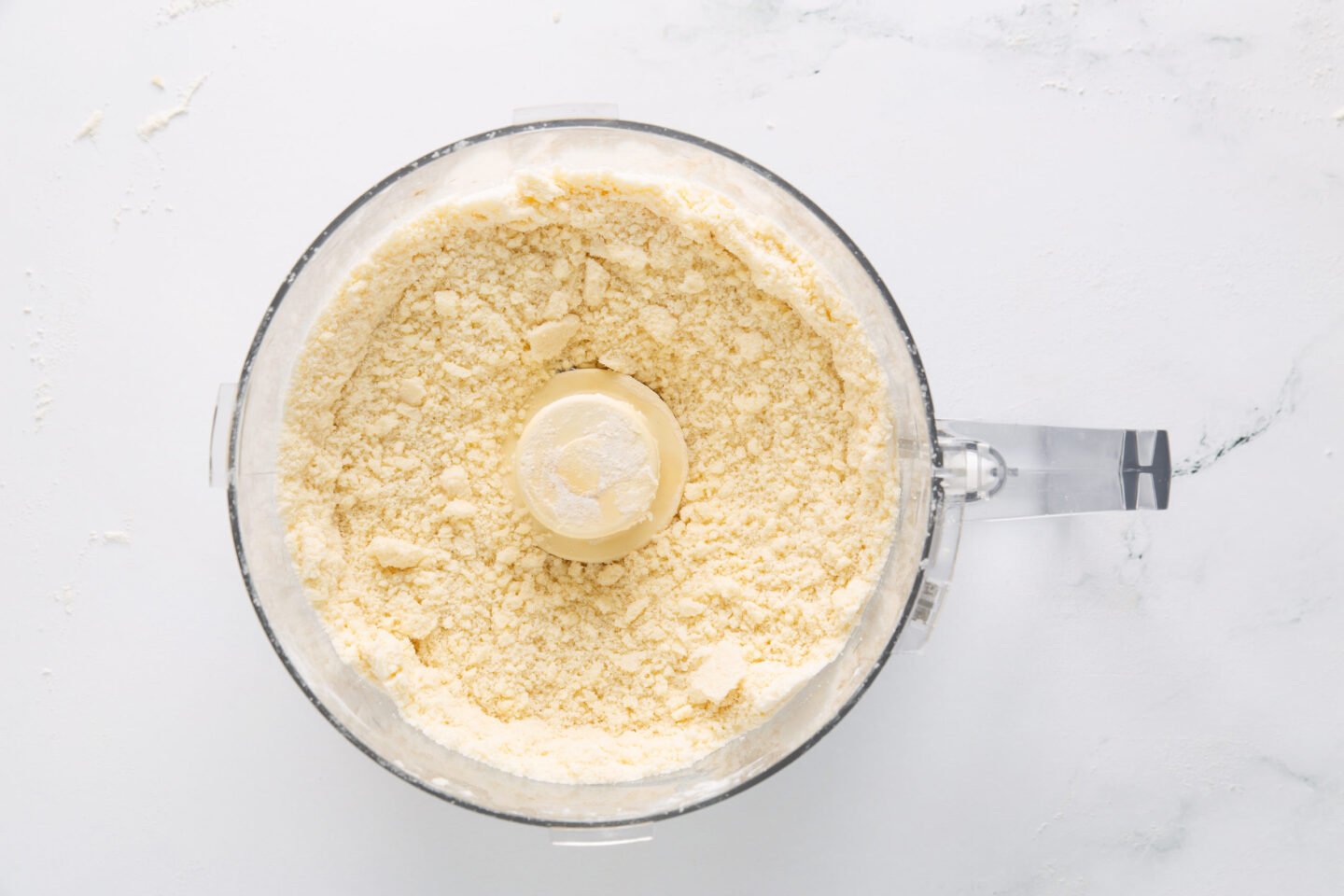 - Add the cold fats to the flour mixture. Pulse in short bursts (about 8–10 times) until you see a coarse, crumbly texture with pea-sized pieces of fat.