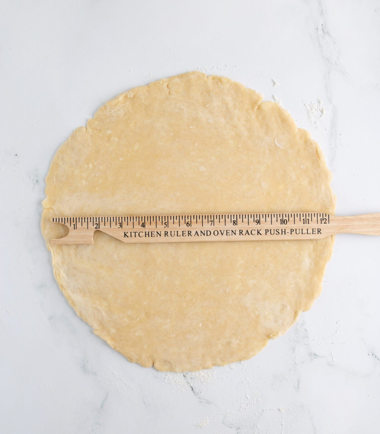 7. Roll it out: Roll into a 13-inch circle and transfer to a 9-inch deep-dish pie plate.