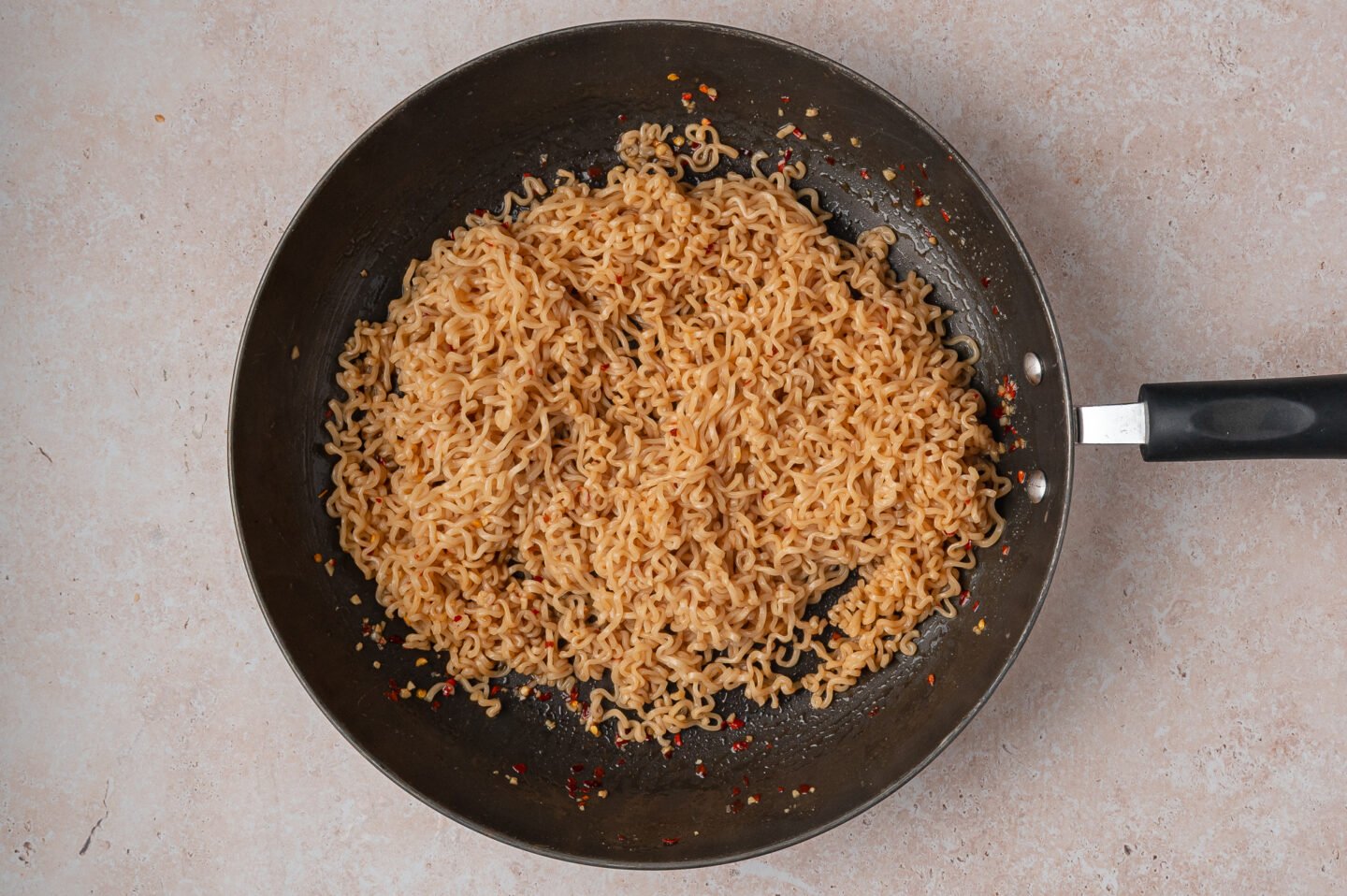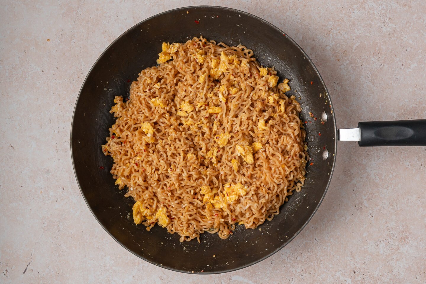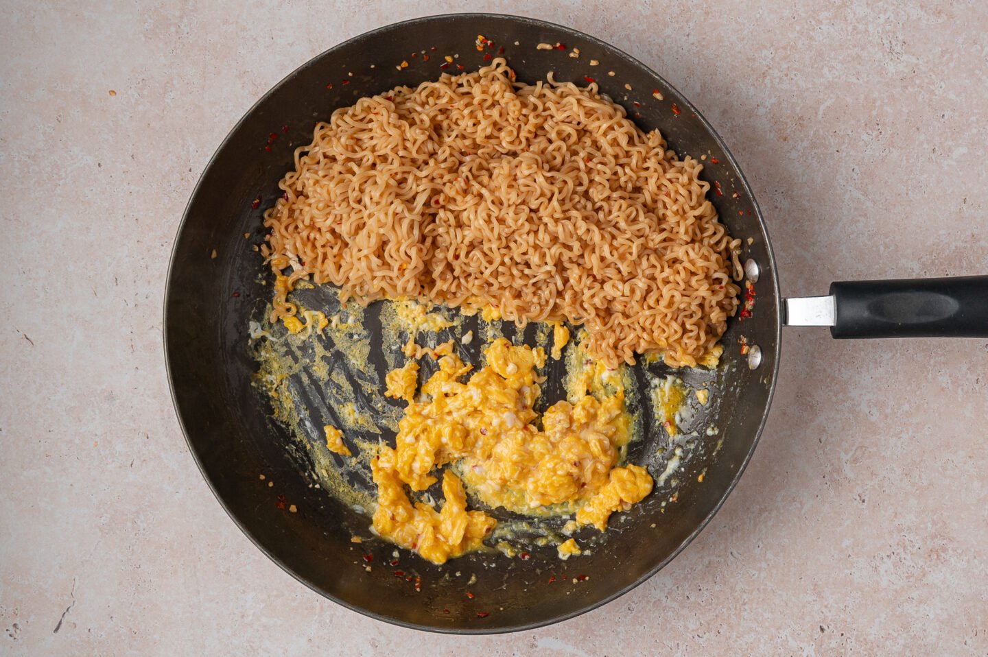 Use a large skillet so the noodles and eggs cook evenly. I love using my favorite nonstick skillet for this recipe because it prevents sticking and makes cleanup easy.