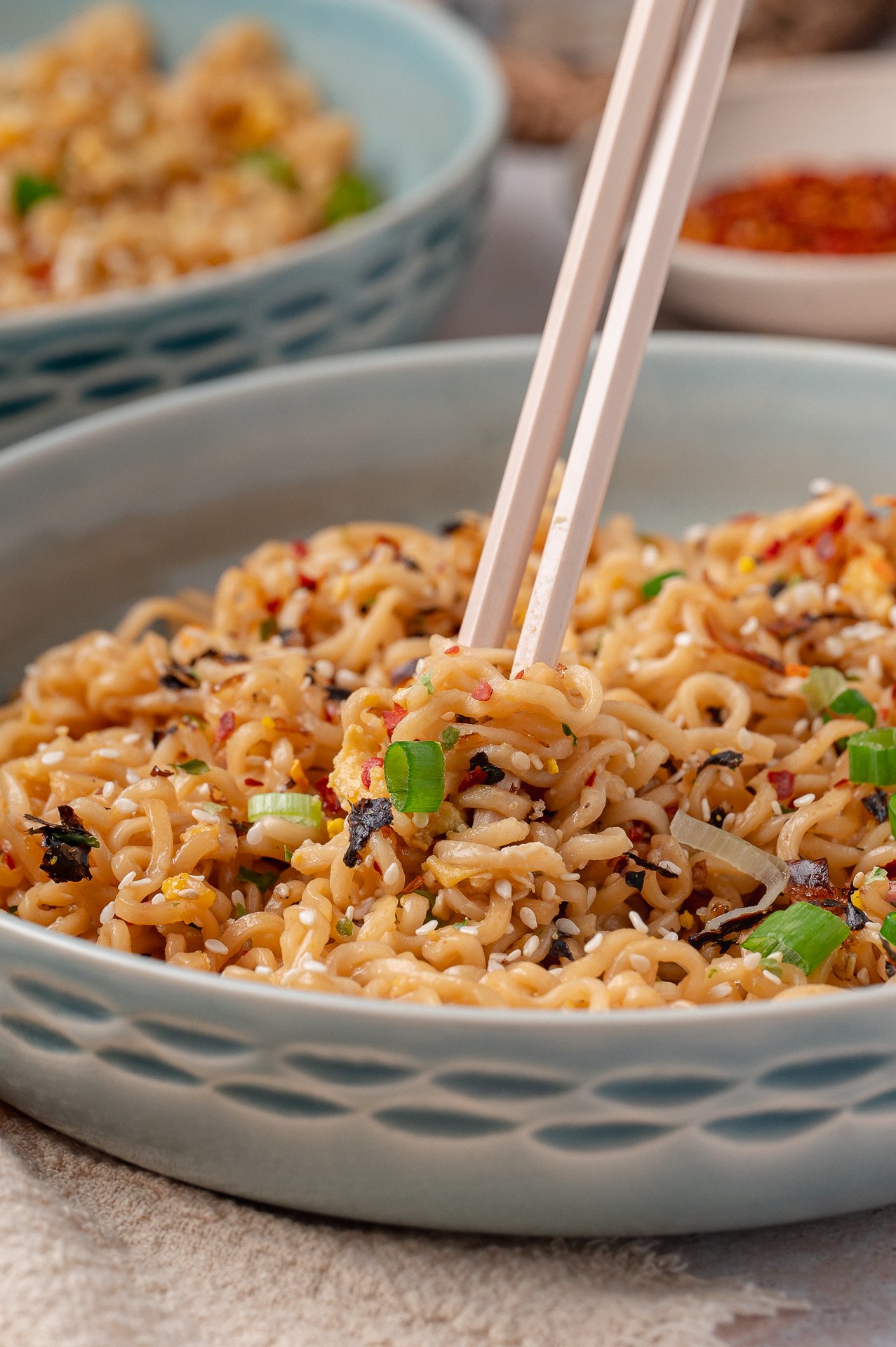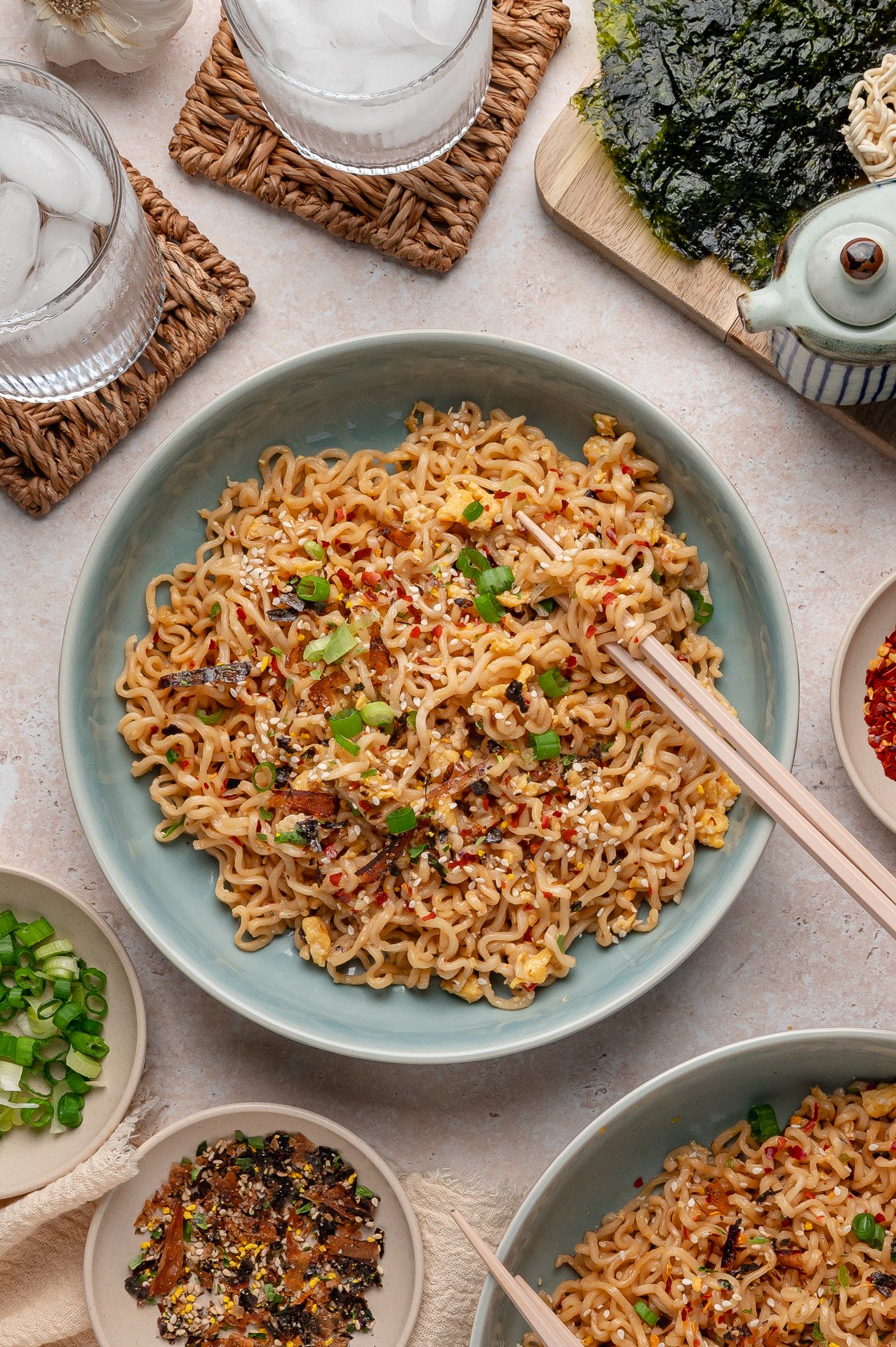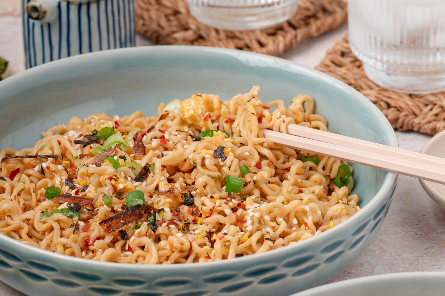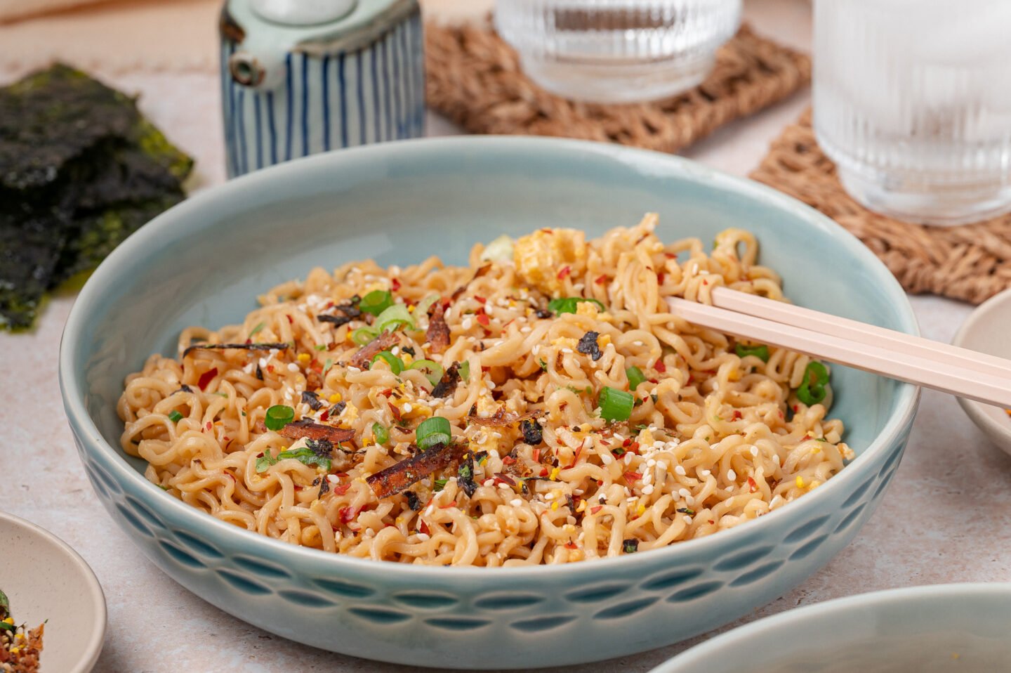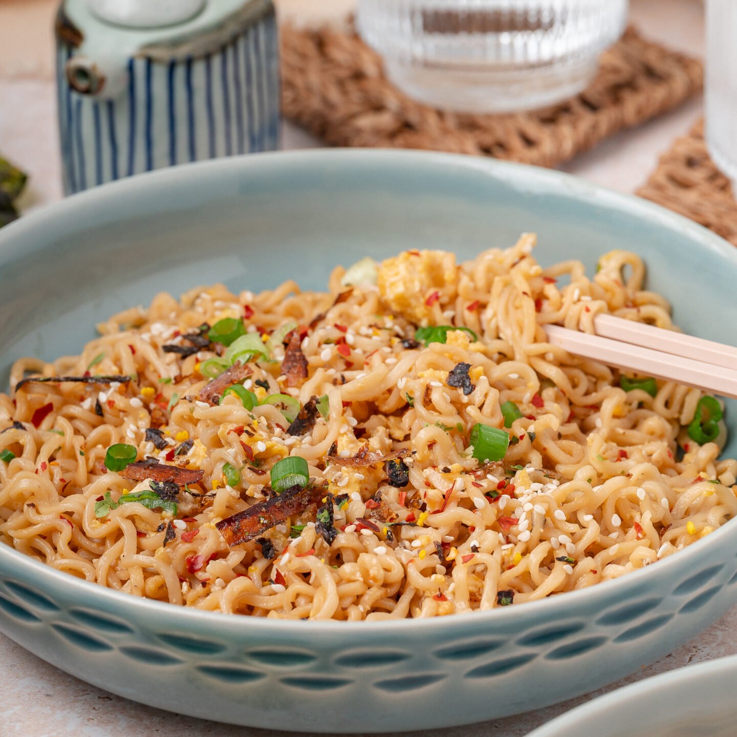 - Sprinkle the furikake and chopped scallions over the noodles.