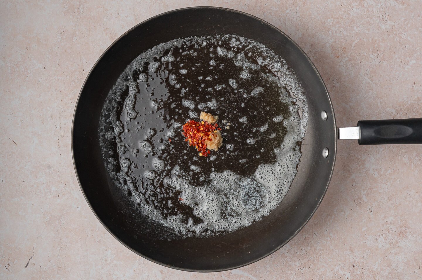 Add minced garlic and red pepper flakes and sauté for about 30 seconds, until fragrant.