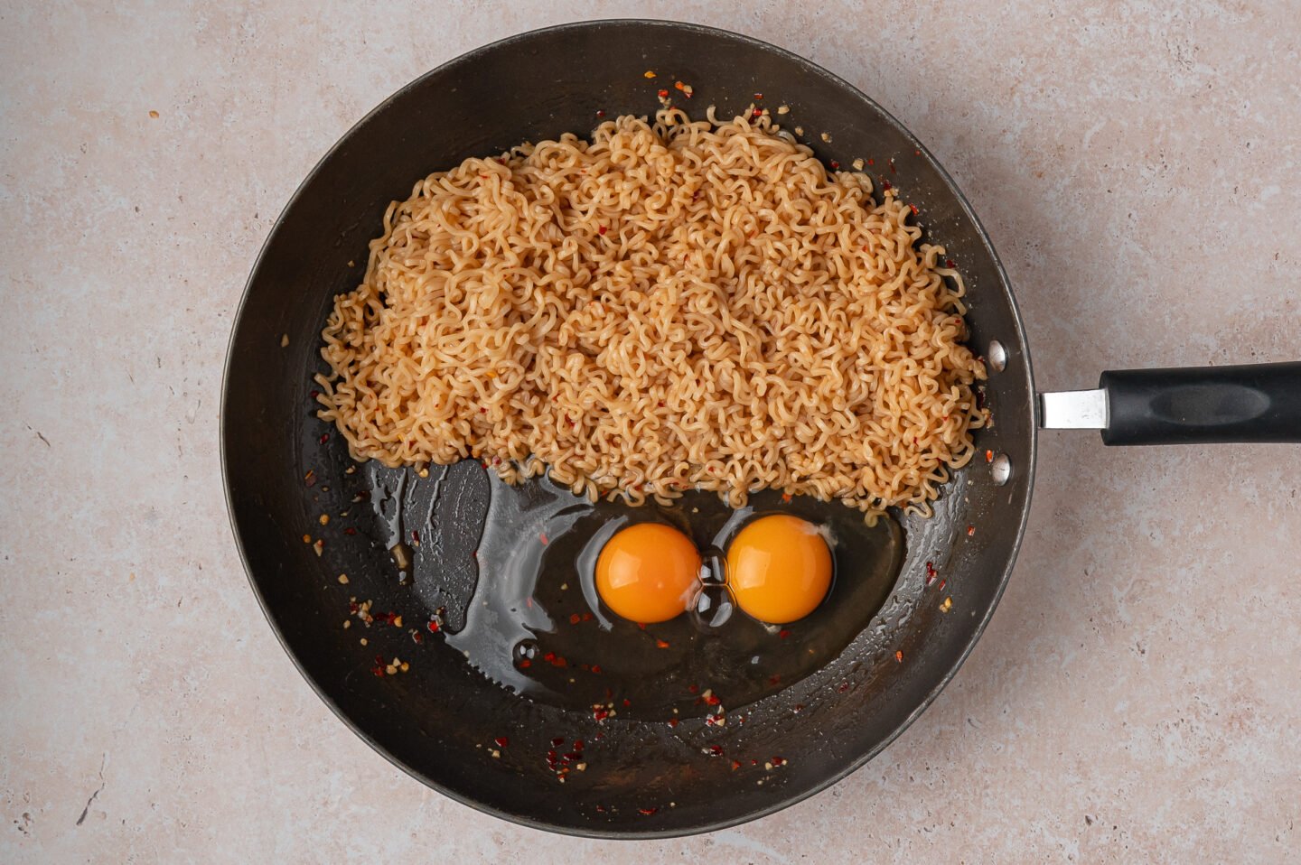 - Push the noodles to one side of the skillet to create an open space. Crack the eggs into the empty side.