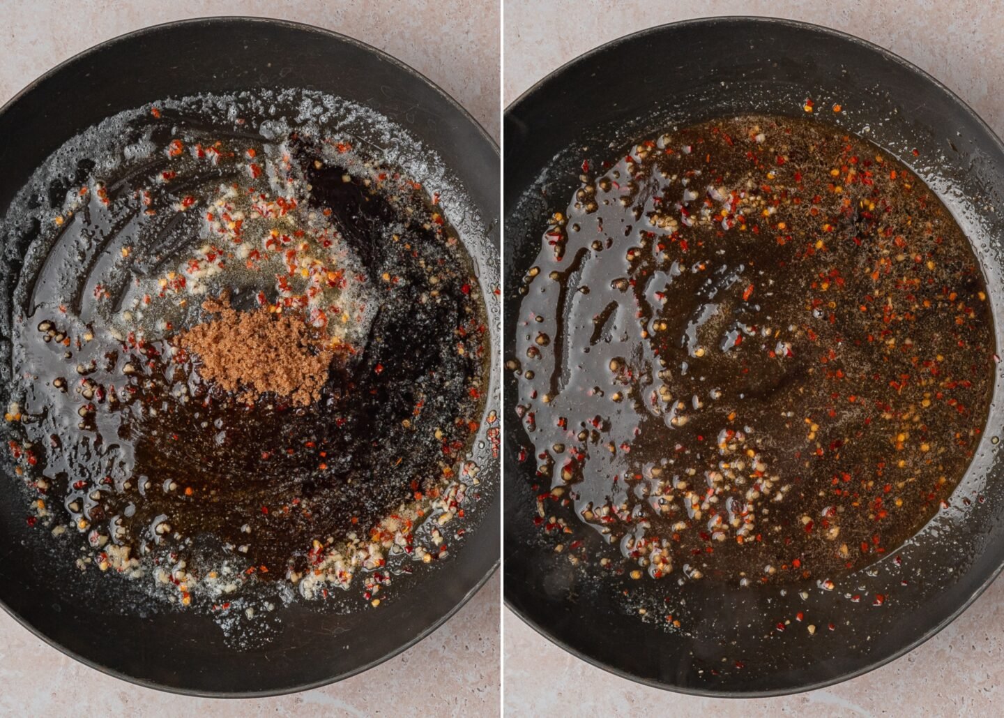 - Stir in the brown sugar and soy sauce. Simmer for another 30 seconds until the sugar dissolves.