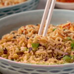 - Divide the noodles between two bowls and serve while hot.