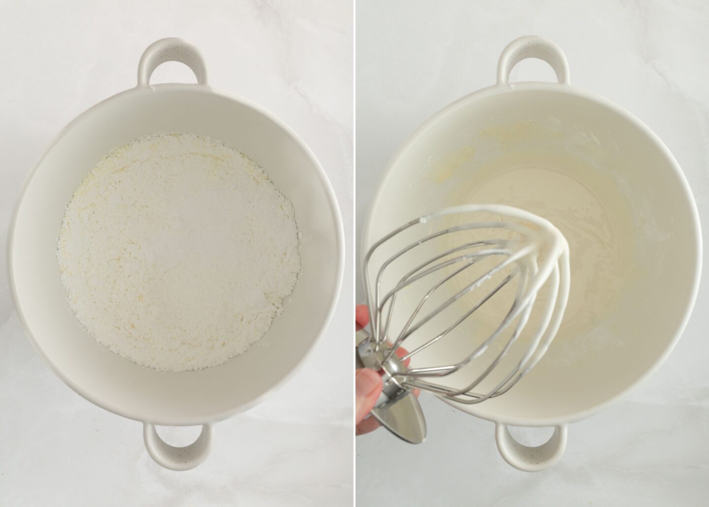 - Combine the powdered sugar and meringue powder in a mixing bowl.