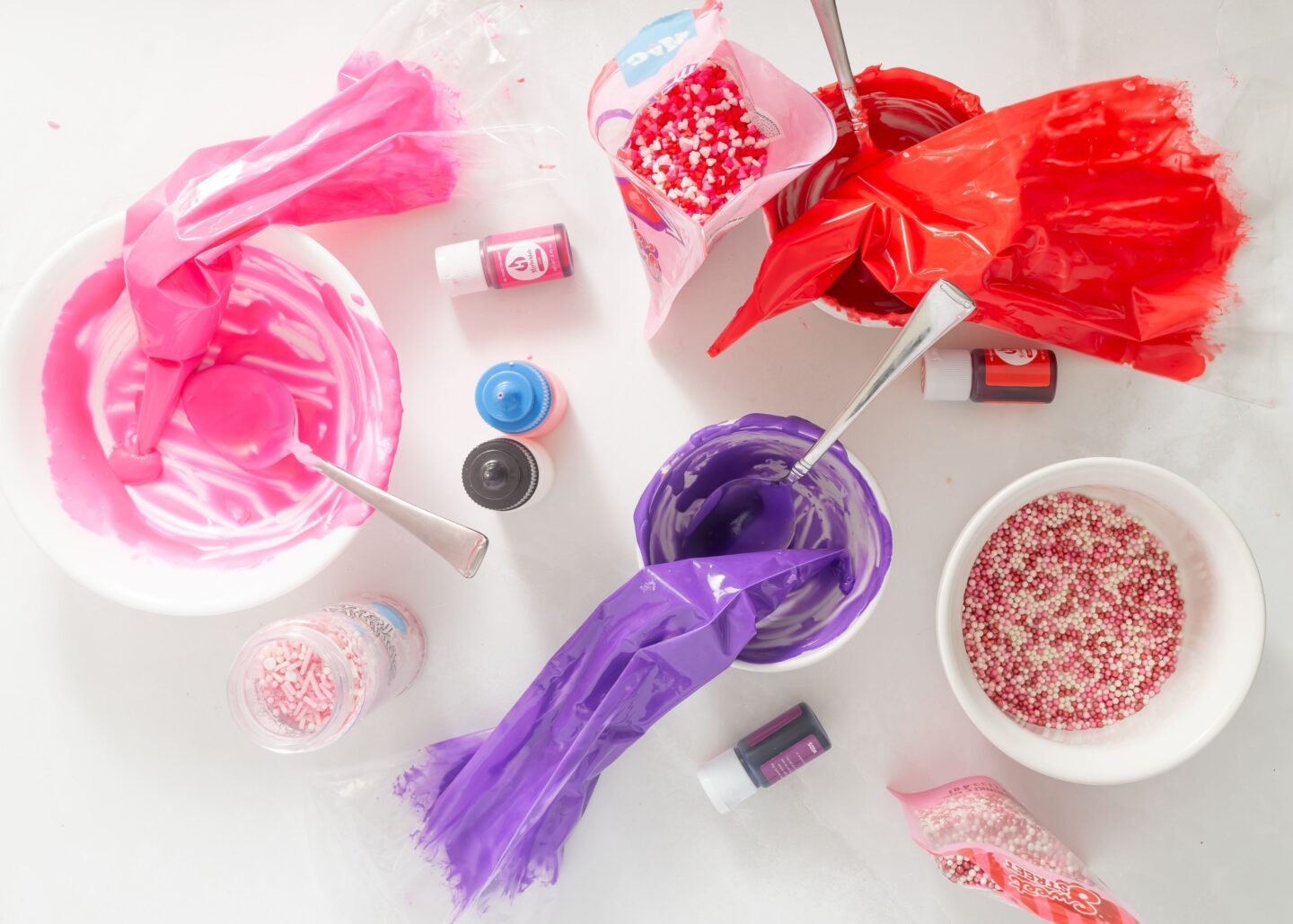 - Divide the icing into separate bowls for coloring and tint with gel food coloring, mixing thoroughly.