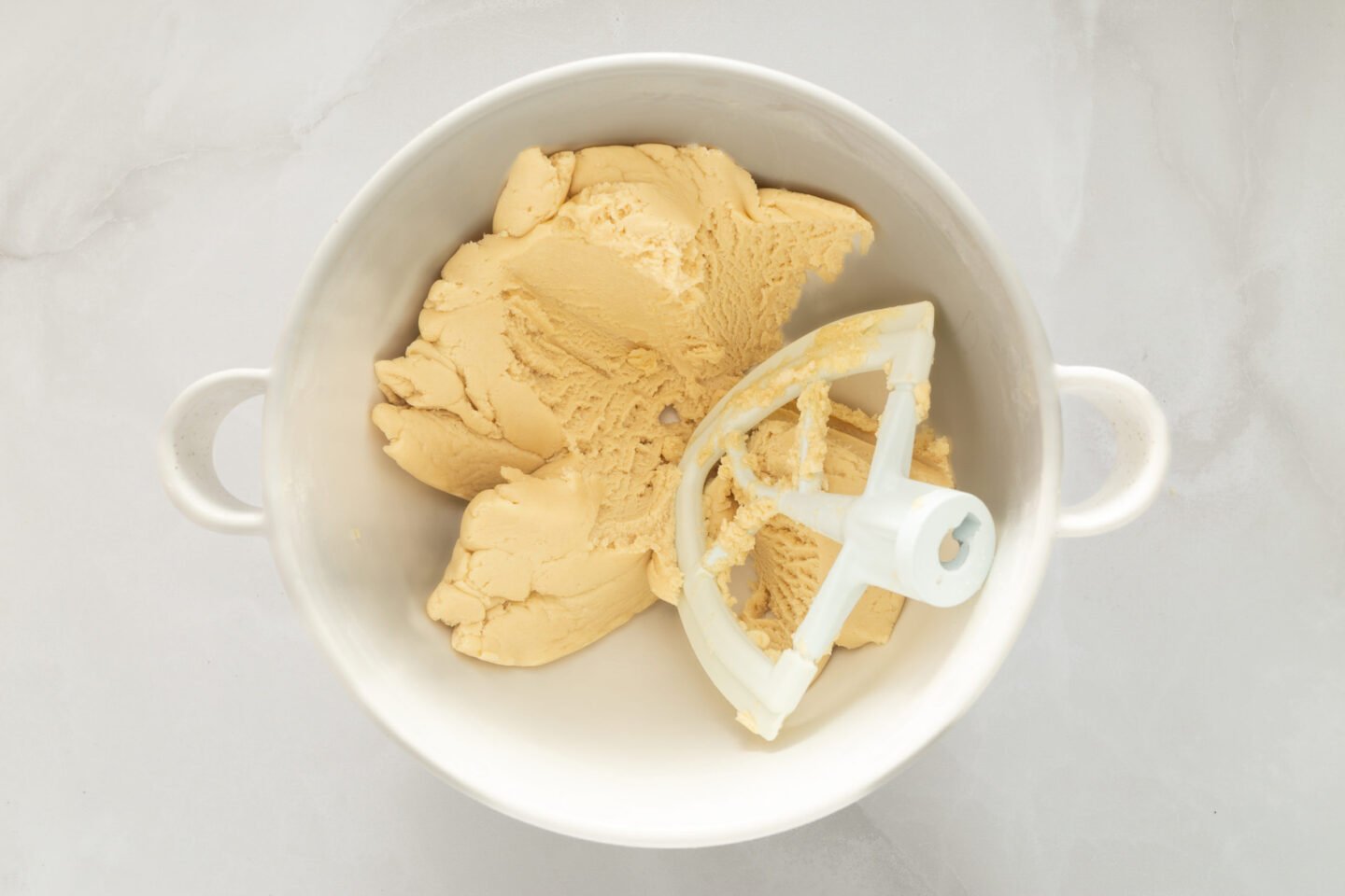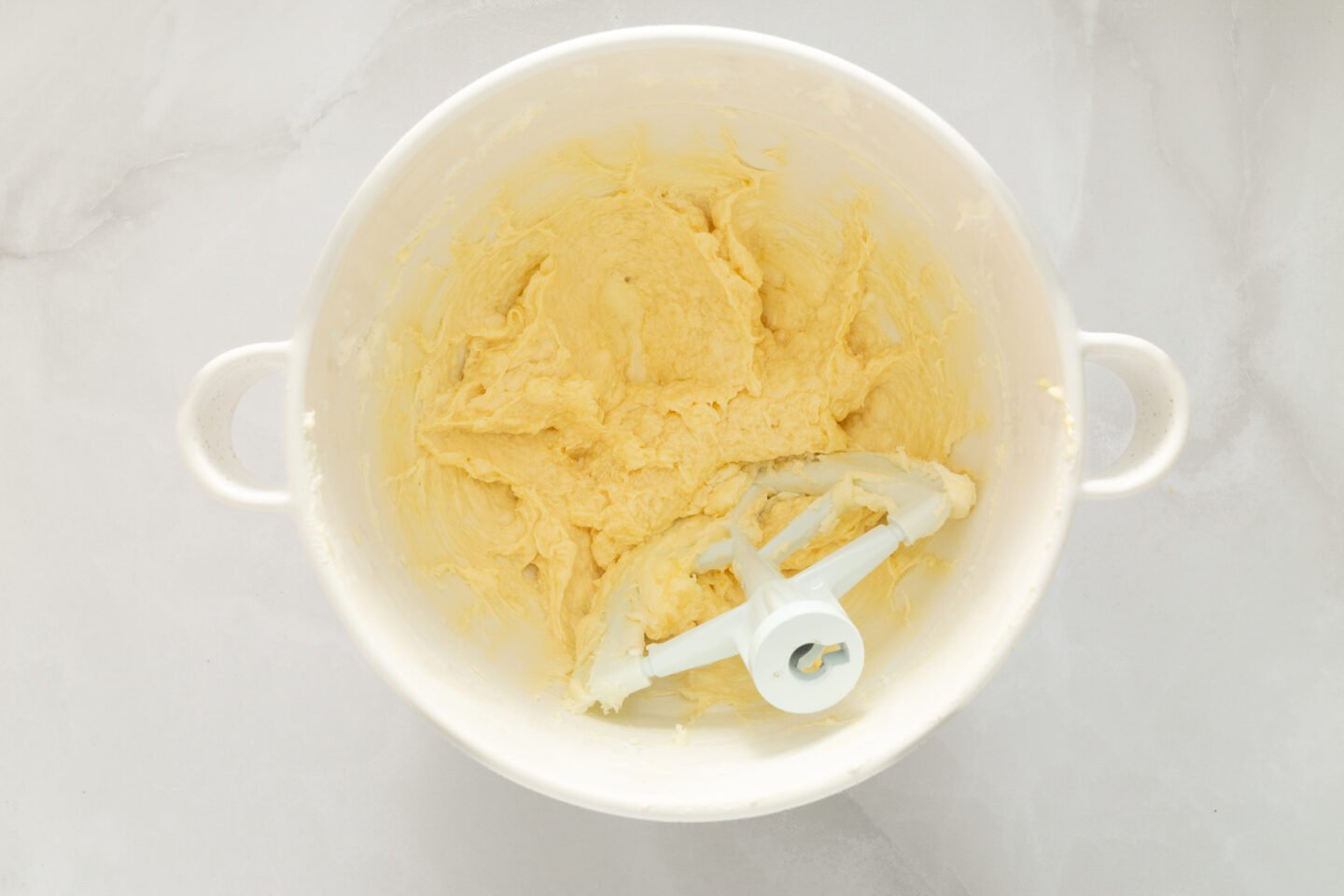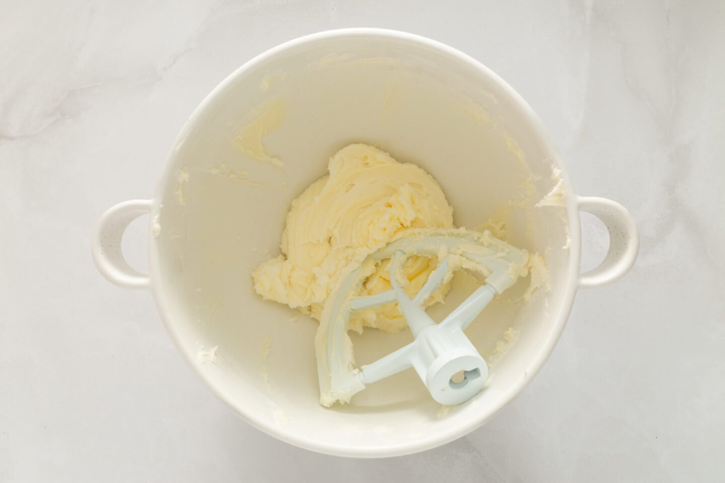 - In a large mixing bowl, beat the softened butter and sugar until light and creamy, about 3 minutes. Scrape the bowl as needed to ensure even mixing.