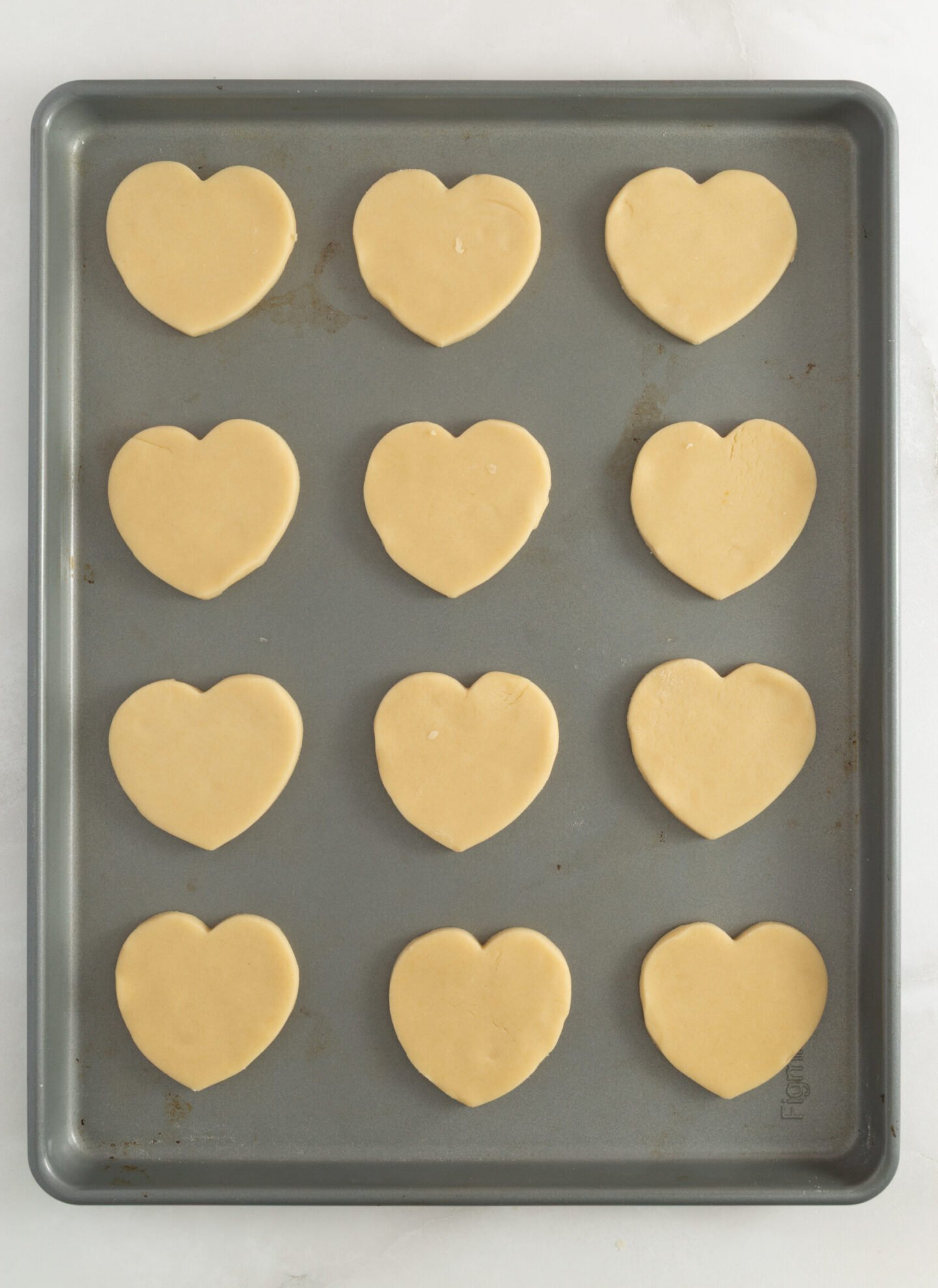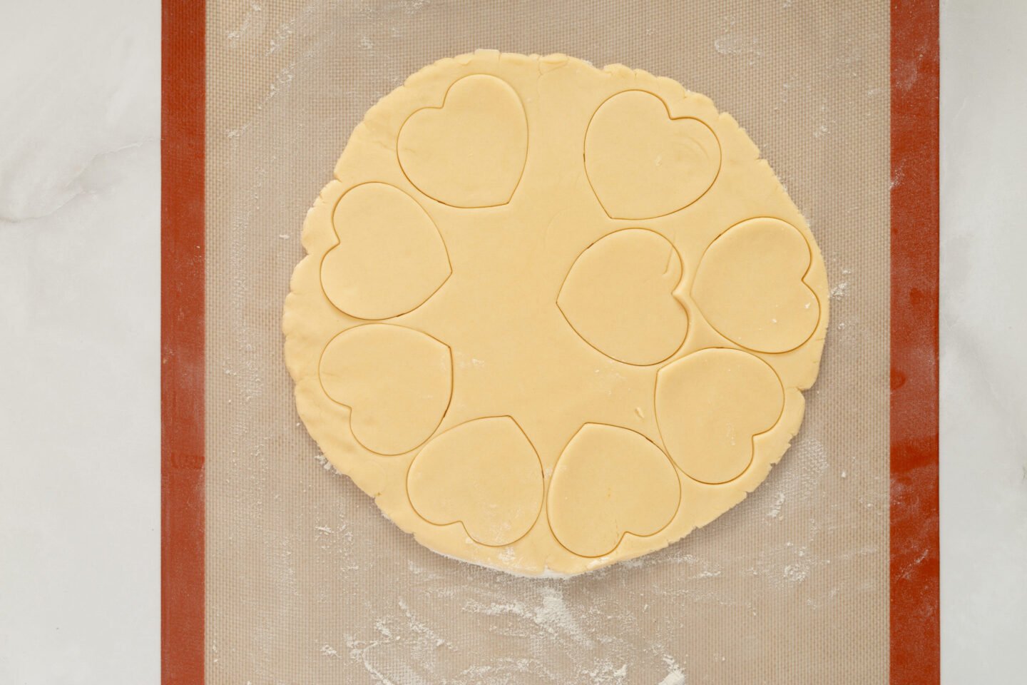 Divide the dough in half and roll each portion to ¼-inch thick on lightly floured parchment. Cut with Valentine cookie cutters.